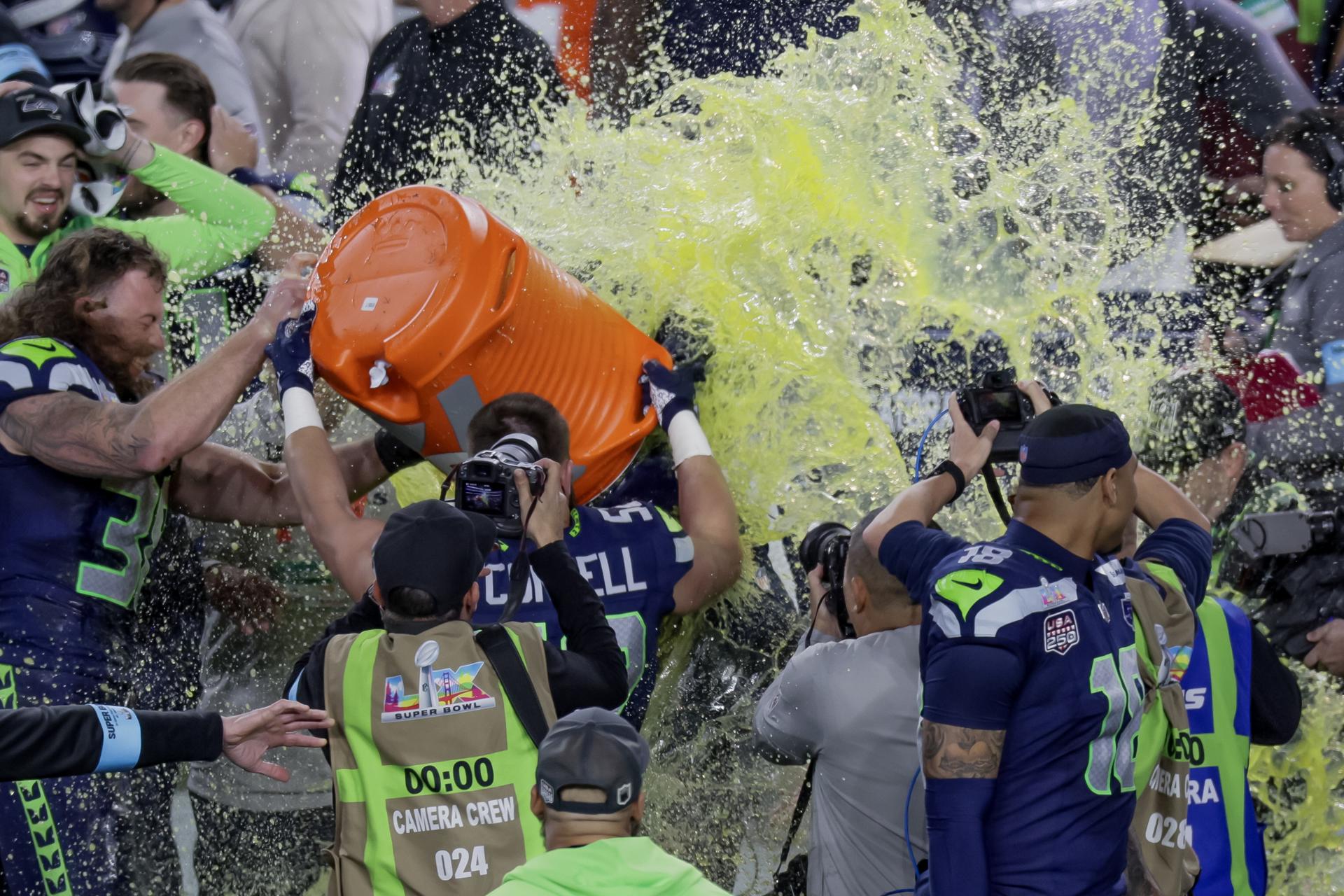 El entrenador de los Seattle Seahawks, Mike MacDonald, recibe un baño de bebida energética de sus jugadores tras conquistar este domingo el Super Bowl LX a expensas de New England Patriots en el Levi’s Stadium de Santa Clara (California) EFE/EPA/CHRIS TORRES