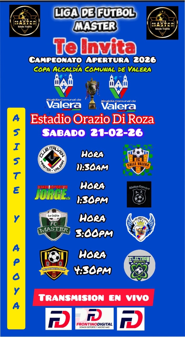 El balompié trujillano se prepara para una jornada de gala este próximo sábado 21 de febrero, para lo cual, el estadio “Orazio Di Rosa” del Club Italven abrirá sus puertas para la inauguración oficial de la Copa “Apertura 2026”, evento de alto nivel organizado por la Liga de Fútbol Máster del estado Trujillo, según publicación de “Hablemos de Deporte”.