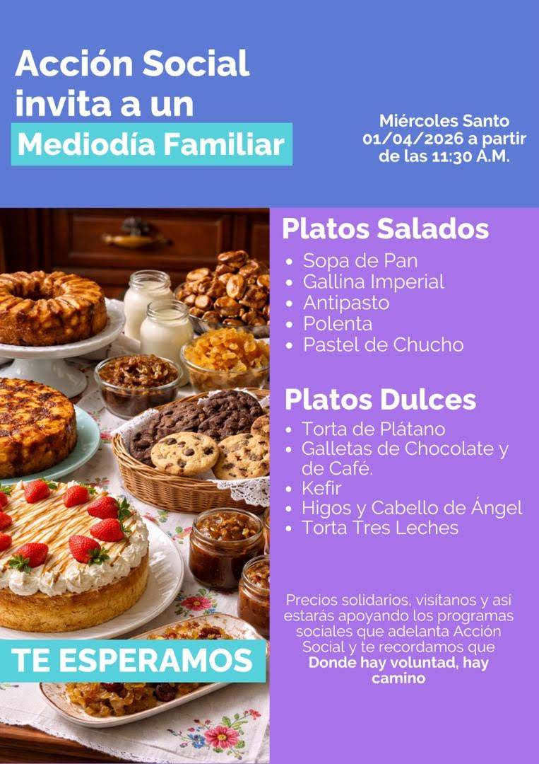 Acción social del municipio Boconó exhorta a la población a un mediodía familiar que se realizará mañana miércoles 01 de abril desde las 11:30 am en sus instalaciones ubicadas por la plaza San Alejo, metros abajo del Liceo Dalla Costa, al lado de Fe y Alegría, donde podrán degustar platillos típicos de la Semana Mayor.