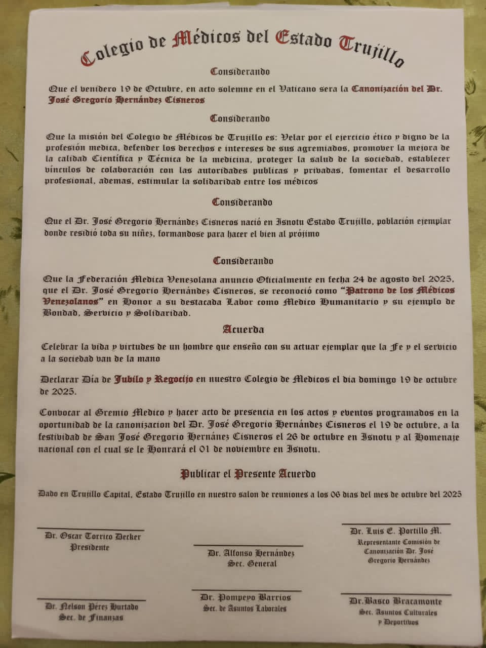 El Colegio de Médicos del estado Trujillo, hizo público el acuerdo tomado con 4 considerandos y el acuerdo tomado, donde señala uno de esos considerandos “que la Federación Médica Venezolana –FMV- anuncio oficialmente el 24 de agosto del año 2025, que el doctor José Gregorio Hernández Cisneros, se reconoció como patrono de los médicos venezolanos, en honor a la destacada labor, como médico humanitario por su ejemplo de bondad, servicio y solidaridad”