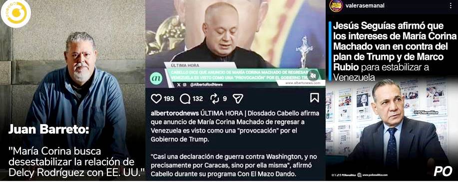 Por su parte, el analista político, Jesús Sequías, quien también se unió a esta macolla, afirma que los intereses de María Corina Machado van en contra del Plan del presidente de los EEUU, Donald Trump y del Secretario de Estado, Marcos Rubio para estabilizar a Venezuela”.