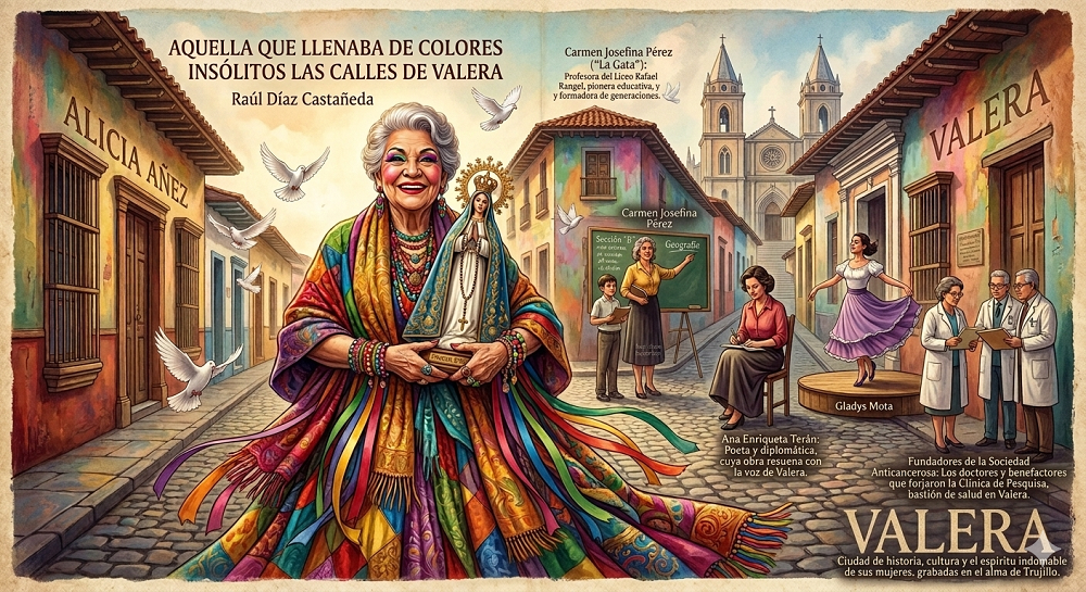 He nombrado, pues, a un grupo de valeranas, que asumieron su ciudadanía no como una circunstancia inevitable, un estar más para existir que para ser, sino como un compromiso trascendente, de amor de prójimo. Pero me reservo para este final, a una mujer totalmente distinta, absolutamente fantástica, que pasó por nuestras calles con una alegría inquebrantable, amiga inconsciente de todos, maquillada hasta la exageración y policromada como un arlequín, sin darse cuenta de su teatralidad, llevando siempre entre sus brazos envejecidos una imagen de Nuestra Señora del Rosario, la Virgen de Durí, de la que el escritor trujillano, de Chejendé, Emigdio Cañizalez Guédez, médico especializado en medicina del trabajo, dejó una semblanza muy bonita, dejando a un lado su formación marxista.