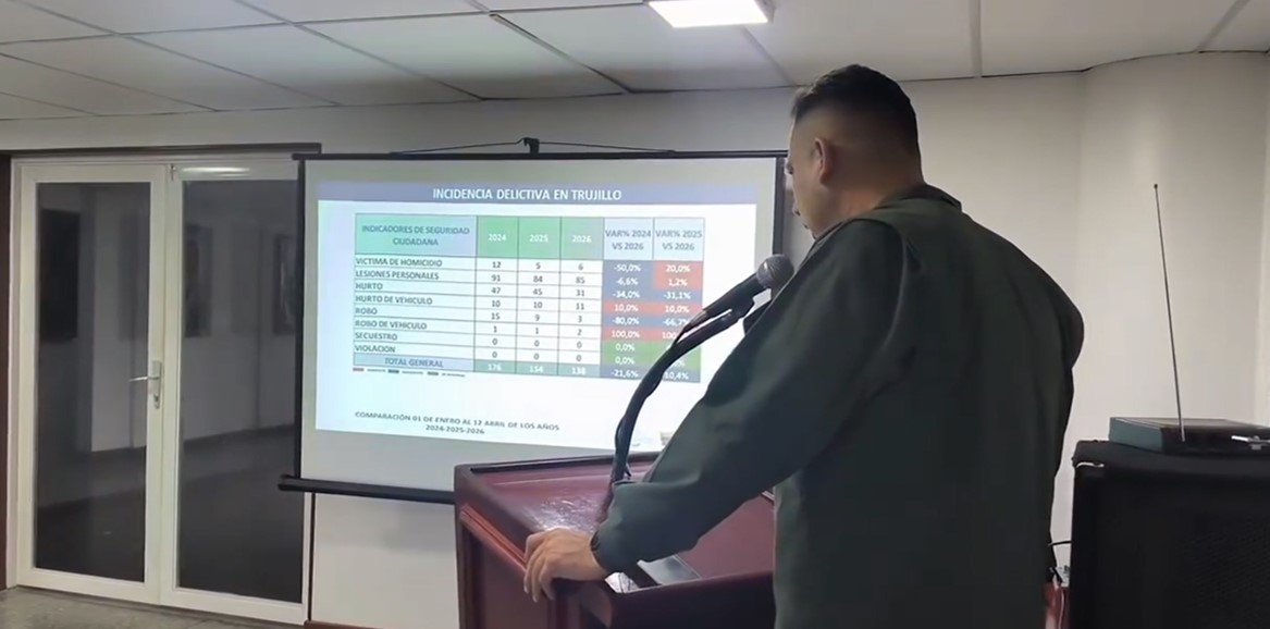 Autoridades de Trujillo presentaron un balance estadístico sobre la seguridad ciudadana en la región, correspondiente al periodo comprendido entre el 1° de enero al 12 de abril de los años 2024, 2025 y 2026. Los datos indican una reducción en el acumulado total de delitos registrados.