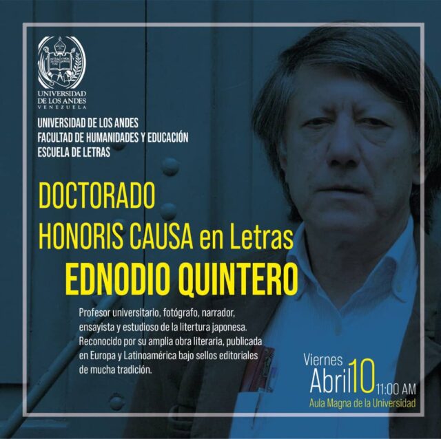 La ULA, facultad de Humanidades y educación, Escuela de letras otorgó este doctorado al profesor universitario, fotógrafo, narrador, ensayista y estudioso de la literatura japonesa, reconocido por su amplía obra literaria, publicada en Europa y Latinoamérica Ennodio Quintero, demostrando que el talento y la disciplina son valorados por la comunidad académica del país.