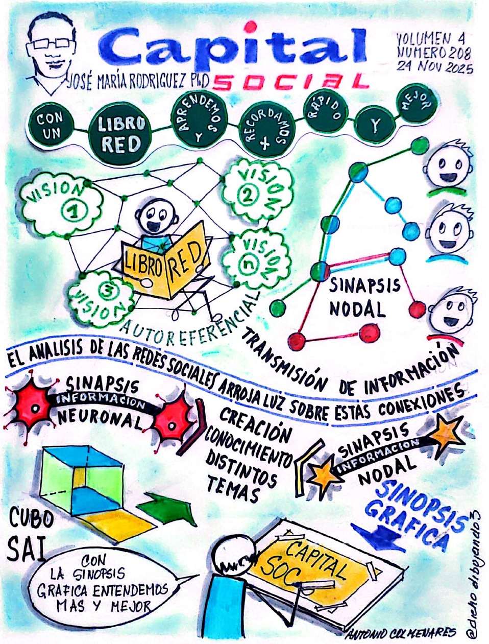 La sinopsis gráfica del ejemplo (conferencia) que hemos traído a colación fue preparada por el arquitecto y artista venezolano, Antonio Colmenares, quien es, también, el ilustrador gráfico de las publicaciones en medios nacionales e internacionales sobre nuestro libro-red: La Tecnología Social Adaptativa e Inteligente (SAI): Creación de capital social desde la perspectiva de la teoría de los sistemas sociales de Niklas Luhmann. La secuencia gráfica presentada por Colmenares le da a la conferencia de Machado un brillo adicional y de esa manera aprendemos más y mejor (Colmenares, 2025). Combinar la sinapsis nodal con la sinopsis gráfica potencia la red de ideas.