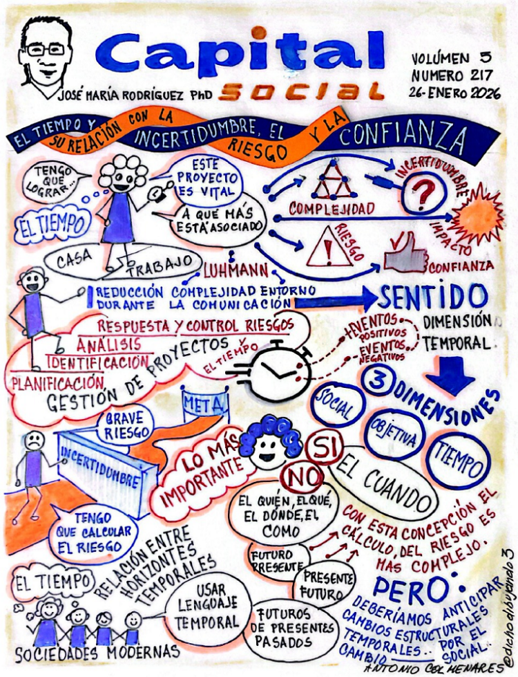 La utilidad práctica del tiempo no necesita demostración. Es posible verla en todas partes, pero podemos hacerla muy palpable cuando nos proponemos alcanzar objetivos, durante la gestión de proyectos, ya sea en la vida personal o en el trabajo. Por otra parte, si profundizamos en su significado, rápidamente veremos que el tiempo está asociado a muchos otros conceptos que son igualmente importantes entender, tales como: complejidad, incertidumbre, impacto, riesgo, confianza, etc. El tema del tiempo, además, nos permite introducir una discusión más abstracta, al relacionársele con los sistemas sociales, à la Luhmann; particularmente, dada su importancia para la reducción de la complejidad del entorno, durante la comunicación (creación de sentido).