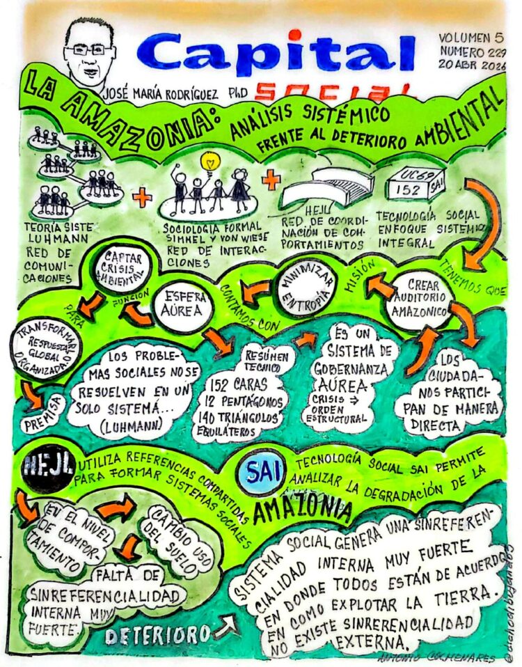 Tenemos que crear un Auditorio Amazónico. La misión es minimizar la entropía social ante la degradación ambiental. Para ello, contamos con una innovación de arquitectura sistémica que hemos denominado Esfera Áurea. Su función, en esta aplicación específica, es captar el “ruido” de la crisis ambiental (entropía) y transformarlo en una respuesta social global organizada. Siguiendo a Luhmann, la premisa es que los problemas ambientales no se resuelven con un solo sistema, sino logrando sincronizar la estructura social (cohesión social sistémica) y la acción de los seres humanos (cohesión social interpersonal). Es un problema transversal que nos afecta a todos.