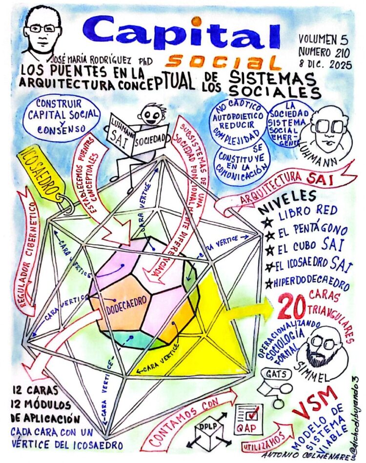 Cuando estudiamos a una sociedad desde la perspectiva sistémica luhmanniana, haciendo uso de la Tecnología Social Adaptativa e Inteligente, SAI, para la construcción de capital social y la creación de consensos, requerimos establecer diez puentes conceptuales, entre los pilares del modelo pentagonal. Son las aristas que forman un pentagrama inscrito dentro de un pentágono regular y simbolizan las interconexiones entre los pilares (vértices) del modelo. Luego, la figura geométrica resultante, al combinar 12 caras iguales, ubica a los subsistemas de una sociedad funcionalmente diferenciada. Este modelo se fundamenta en la dualidad dodecaedro-icosaedro.