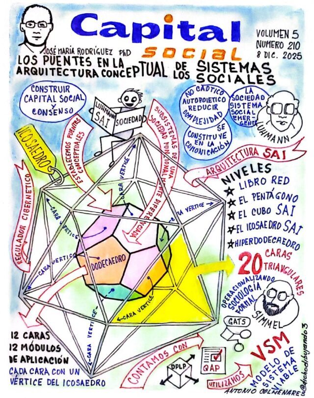 Cuando estudiamos a una sociedad desde la perspectiva sistémica luhmanniana, haciendo uso de la Tecnología Social Adaptativa e Inteligente, SAI, para la construcción de capital social y la creación de consensos, requerimos establecer diez puentes conceptuales, entre los pilares del modelo pentagonal. Son las aristas que forman un pentagrama inscrito dentro de un pentágono regular y simbolizan las interconexiones entre los pilares (vértices) del modelo. Luego, la figura geométrica resultante, al combinar 12 caras iguales, ubica a los subsistemas de una sociedad funcionalmente diferenciada. Este modelo se fundamenta en la dualidad dodecaedro-icosaedro.