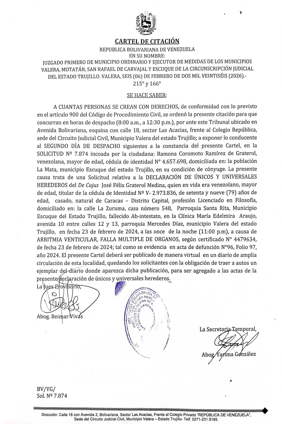 Cartel de citación A CUANTAS PERSONAS SE CREAN CON DERECHOS en la solicitud de DECLARACIÓN DE ÚNICOS Y UNIVERSALES HEREDEROS del De Cujus José Félix Graterol Medina, quien en vida era titular de la cédula de Identidad No V- 2.973.836