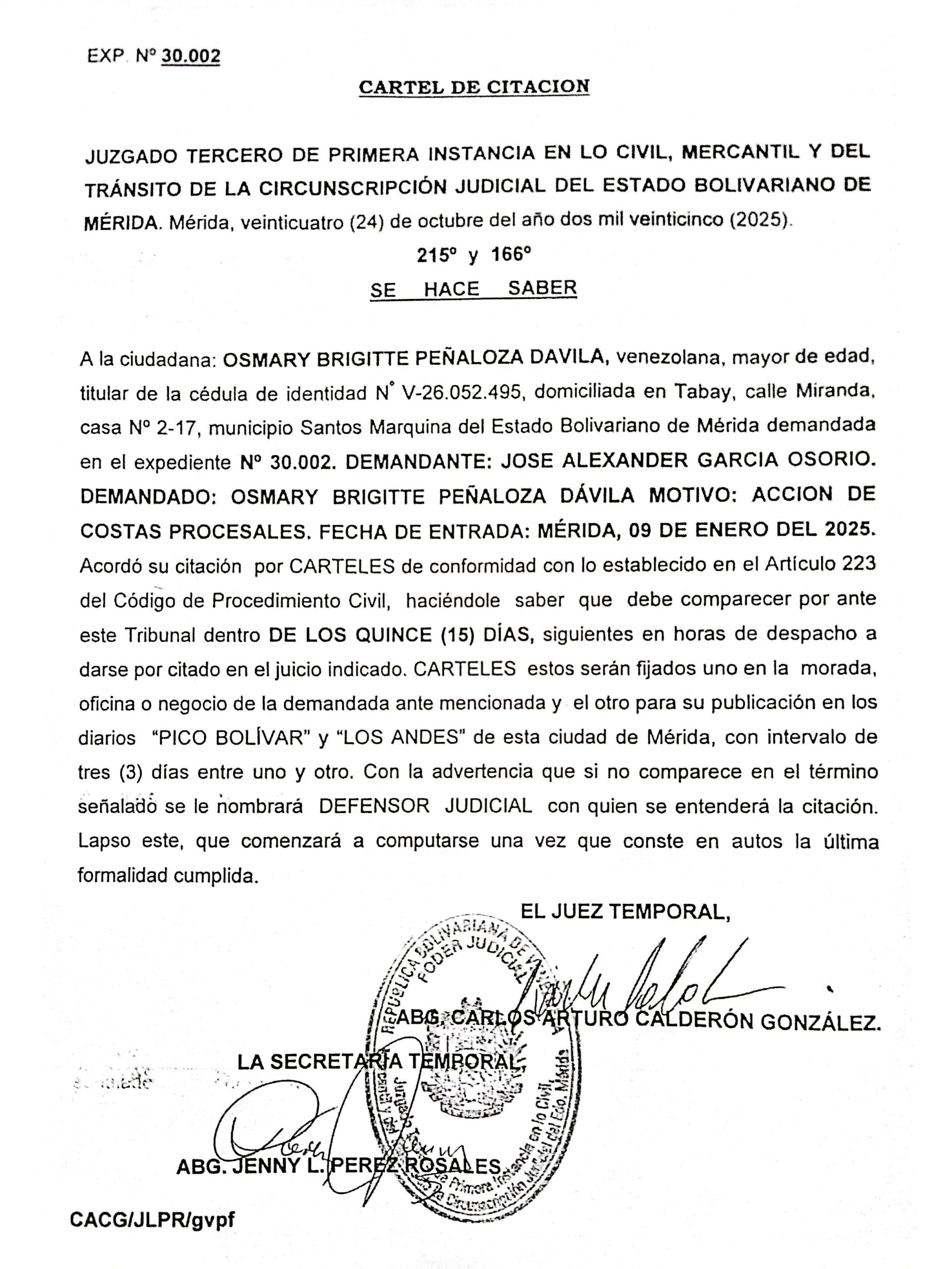Cartel de citación a la ciudadana OSMARY BRIGITTE PEÑALOZA DAVILA, titular de la cédula de identidad N° V-26.052.495