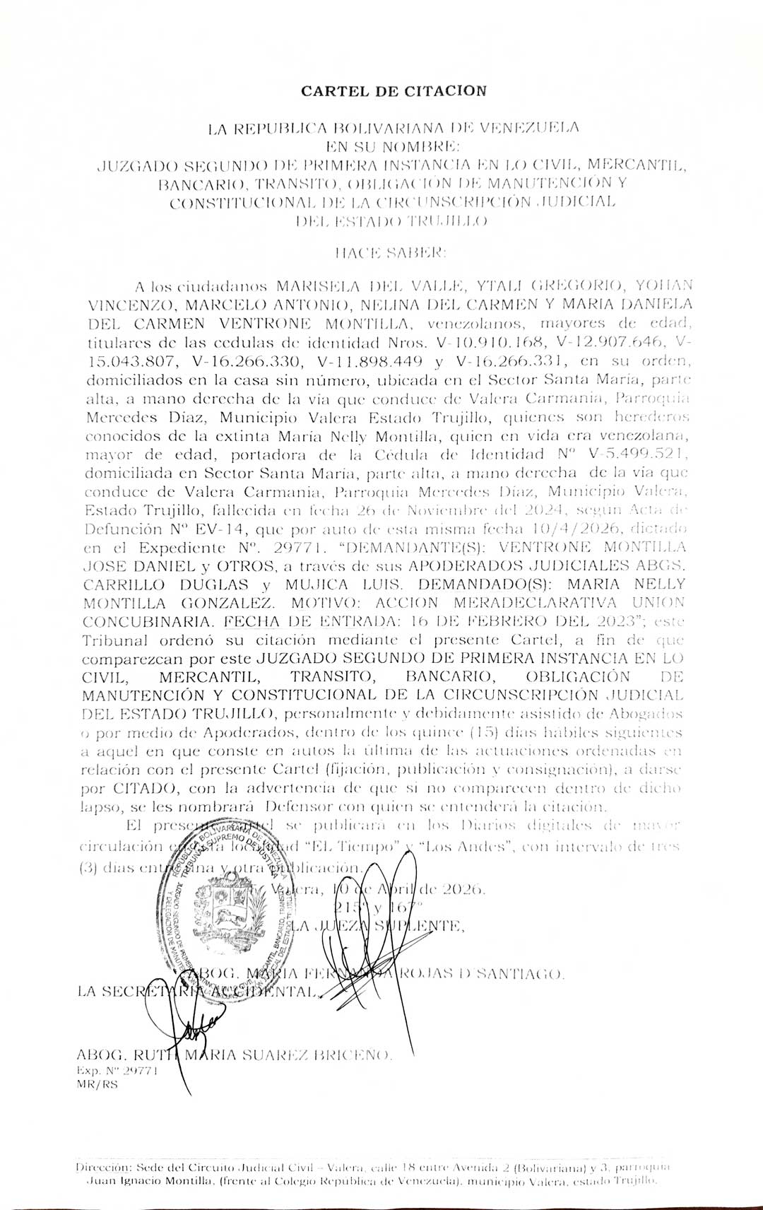 Cartel de citación a los ciudadanos MARISELA DEL VALLE, YTALI GREGORIO, YOHAN VINCENZO, MARCELO ANTONIO, NELINA DEL CARMEN Y MARIA DANIELA DEL CARMEN VENTRONE MONTILLA, titulares de las cedulas de identidad Nros. V-10.910.168, V-12.907.646, V- 15.043.807, V-16.266.330, V-11.898.449 y V-16.266.331