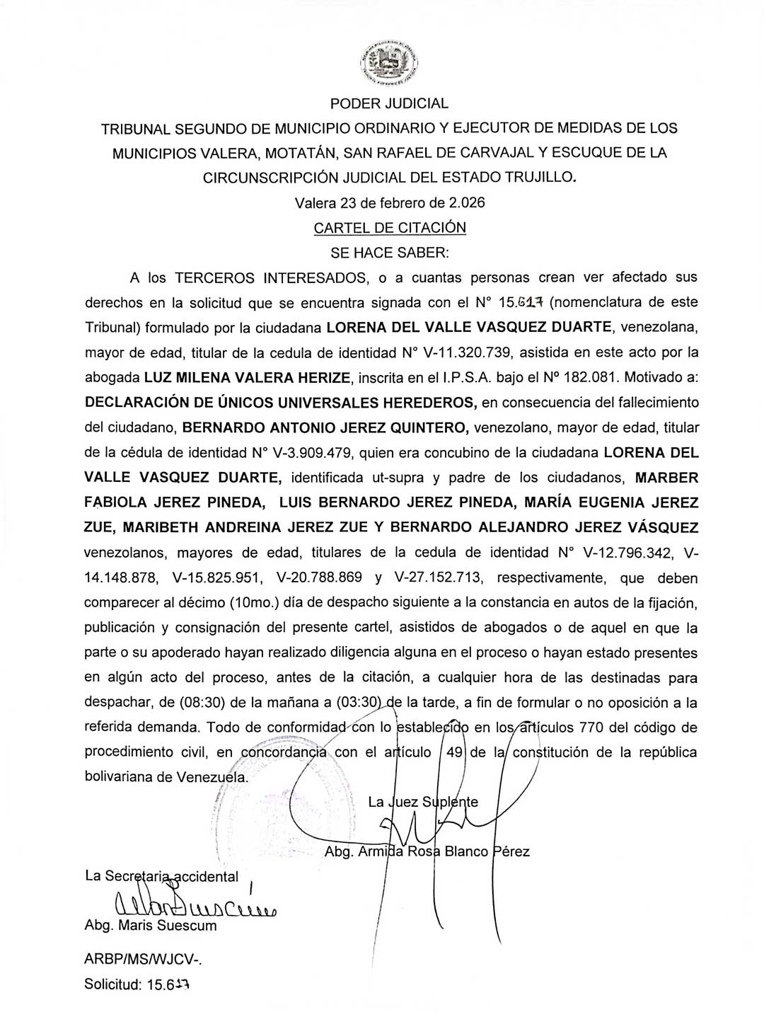 Cartel de citación A los TERCEROS INTERESADOS, o a cuantas personas crean ver afectado sus derechos en la solicitud de DECLARACIÓN DE ÚNICOS UNIVERSALES HEREDEROS, en consecuencia del fallecimiento del ciudadano, BERNARDO ANTONIO JEREZ QUINTERO, titular de la cédula de identidad N° V-3.909.479