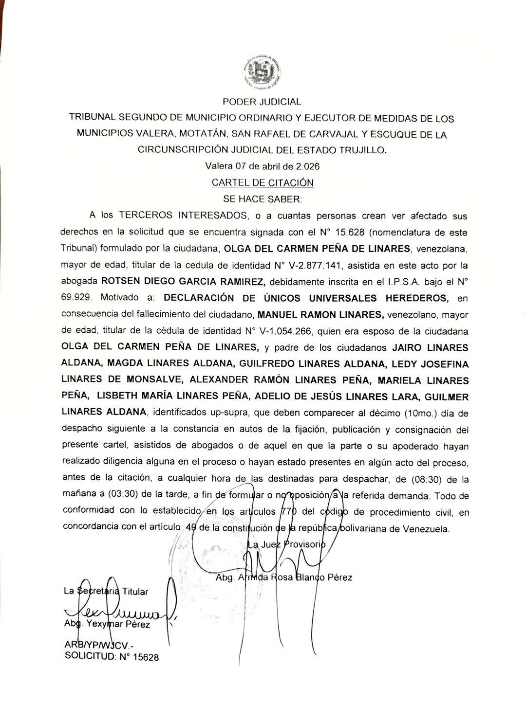 Cartel de citación a los TERCEROS INTERESADOS, o a cuantas personas crean ver afectado sus derechos en la solicitud de DECLARACIÓN DE ÚNICOS UNIVERSALES HEREDEROS, en consecuencia del fallecimiento del ciudadano, MANUEL RAMON LINARES, titular de la cédula de identidad N° V-1.054.266