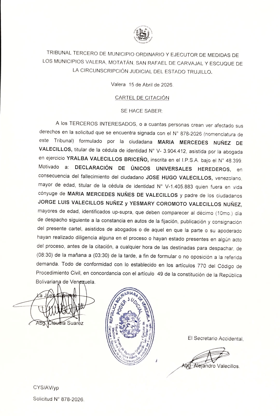 Cartel de citación a los TERCEROS INTERESADOS, o a cuantas personas crean ver afectado sus derechos en la solicitud DECLARACIÓN DE ÚNICOS UNIVERSALES HEREDEROS, en consecuencia del fallecimiento del ciudadano JOSE HUGO VALECILLOS, titular de la cédula de identidad N° V-1.405.883