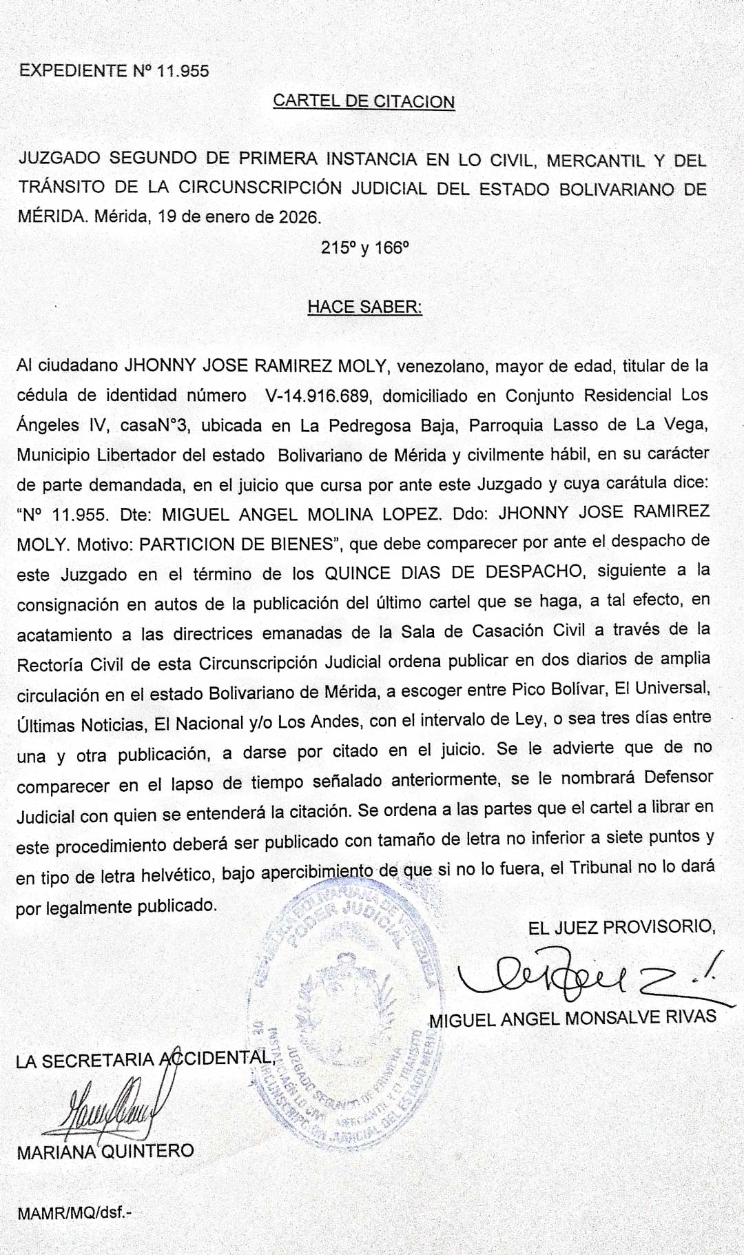 Cartel de citación al ciudadano JHONNY JOSE RAMIREZ MOLY, titular de la cédula de identidad número V-14.916.689