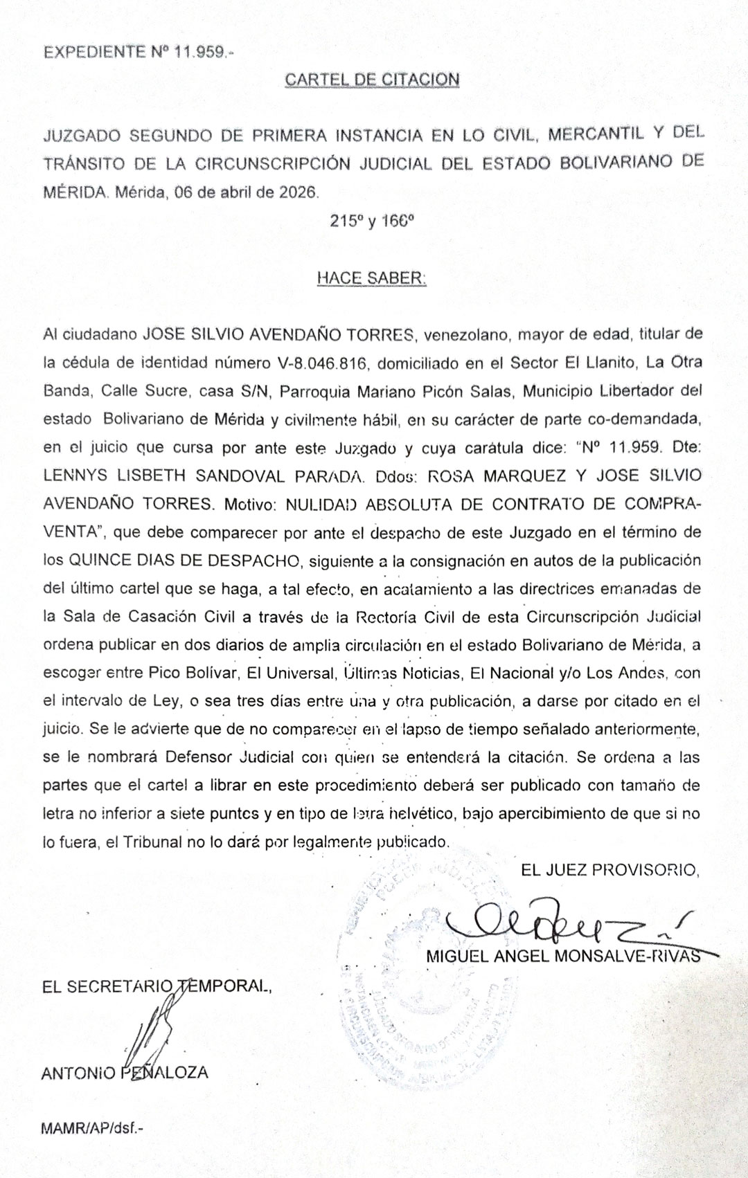 EDICTO. Se hace saber A los HEREDEROS DESCONOCIDOS de los ciudadanos PEDRO MARIA MONSALVE Y MARIA GORGONIA BARRIOS DE ANDRADE, y a TODAS AQUELLAS PERSONAS que se crean con derechos o tengan interès directo y manifiesto, en el juicio de PRESCRIPCIÓN ADQUISITIVA, contra los herederos desconocidos de la causante MARIA MELANIA RIVAS UZCATEGUI (10-04-2026)