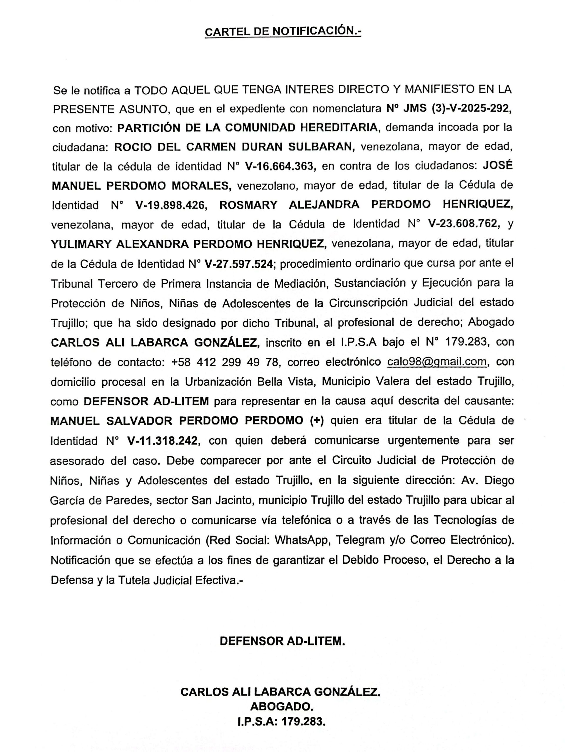 CARTEL DE NOTIFICACIÓN. Se le notifica a TODO AQUEL QUE TENGA INTERES DIRECTO Y MANIFIESTO EN LA PRESENTE ASUNTO, con motivo: PARTICIÓN DE LA COMUNIDAD HEREDITARIA, demanda incoada por la ciudadana: ROCIO DEL CARMEN DURAN SULBARAN, venezolana, con cédula de identidad N° V-16.664.363, en contra de los ciudadanos: JOSÉ MANUEL PERDOMO MORALES, con Cédula de Identidad N° V-19.898.426, ROSMARY ALEJANDRA PERDOMO HENRIQUEZ, con Cédula de Identidad N° V-23.608.762, y YULIMARY ALEXANDRA PERDOMO HENRIQUEZ, con Cédula de Identidad N° V-27.597.524