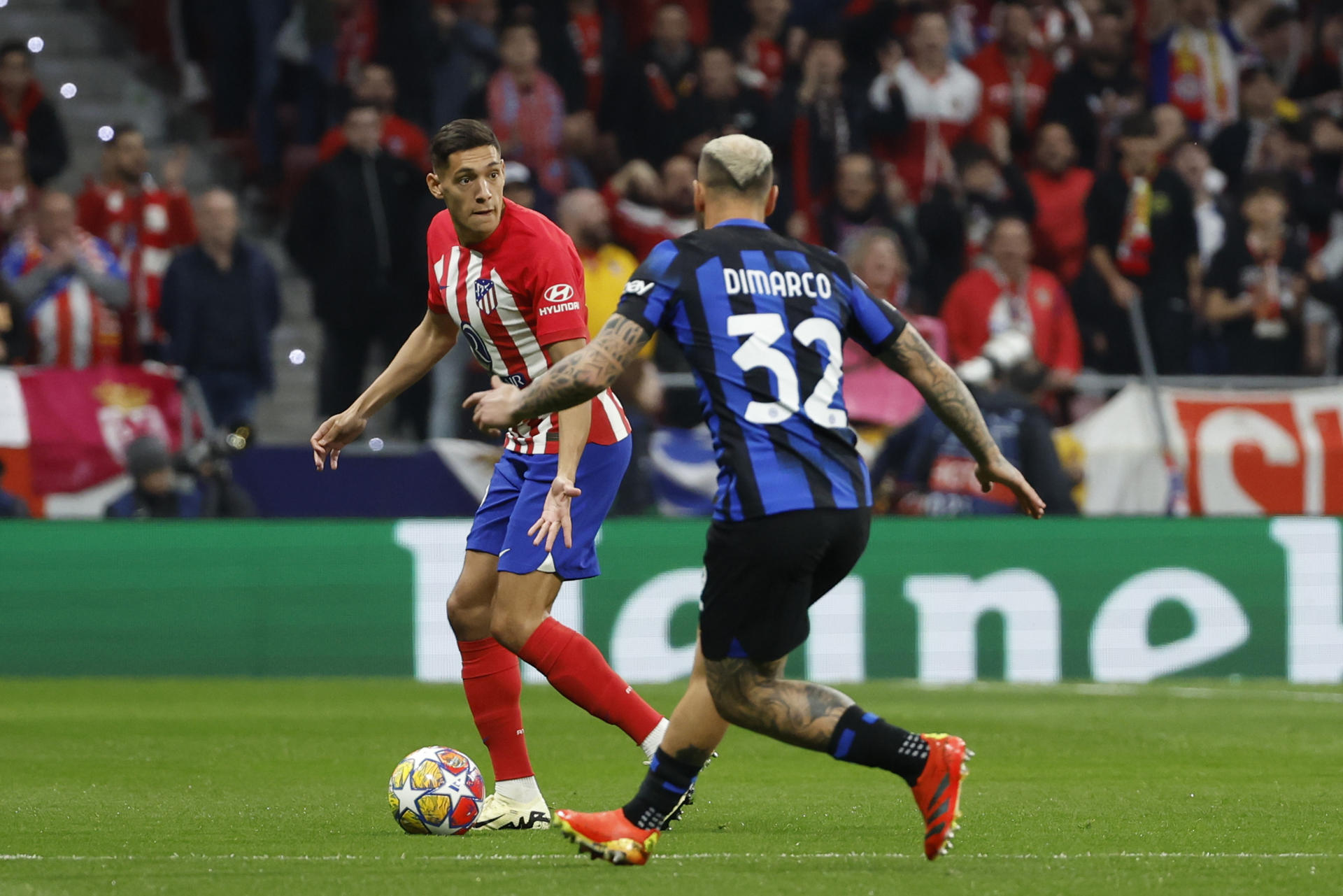 Nahuel Molina, ante Dimarco, en el Atlético-Inter de 2024. EFE / Mariscal.