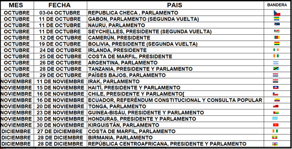En la continuidad de la reafirmación de la Democracia en diversos países del mundo se avanza con el calendario electoral que definirá a través del VOTO la decisión de quienes serán los próximos Presidentes y Parlamentarios que tendrán la honorable responsabilidad en el orden Ejecutivo y Legislativo confortar las bondades del servicio público a la Ciudadanía en general, nos luce más que atractivo una sensación de empoderamiento de la cualidad y condición demócrata en el sentimiento colectivo de cada una de las naciones que tendrán tan enaltecedora condición y circunstancia. QUE VIVA LA DEMOCRACIA