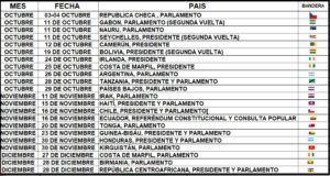En la continuidad de la reafirmación de la Democracia en diversos países del mundo se avanza con el calendario electoral que definirá a través del VOTO la decisión de quienes serán los próximos Presidentes y Parlamentarios que tendrán la honorable responsabilidad en el orden Ejecutivo y Legislativo confortar las bondades del servicio público a la ciudadanía en general, nos luce más que atractivo una sensación de empoderamiento de la cualidad y condición demócrata en el sentimiento colectivo de cada una de las naciones que tendrán tan enaltecedora condición y circunstancia. QUE VIVA LA DEMOCRACIA.