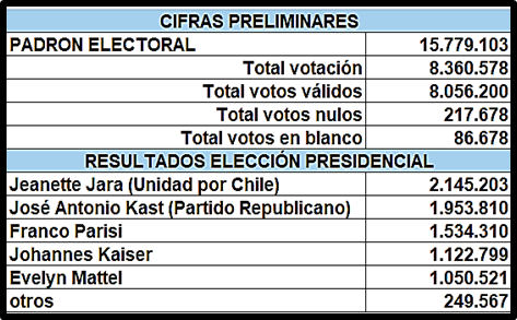 Es de mencionar que, tras una década de VOTO VOLUNTARIO y BAJA PARTICIPACIÓN, el voto obligatorio fue restablecido mediante una reforma constitucional. En efecto, la Ley N° 21.524 (promulgada a fines de 2022) modificó la Constitución Política de la República de Chile para establecer nuevamente el sufragio como obligatorio, tras una década de ejercerse en forma voluntaria. Este voto obligatorio entró en plena vigencia para todas las elecciones y plebiscitos (excepto para las elecciones primarias), a partir de los procesos que se realizaron luego de la promulgación de la ley, siendo su primera aplicación el Plebiscito Constitucional de Salida de septiembre de 2022, y continuó con la elección del Consejo Constitucional en mayo de 2023, así como en todas las votaciones que se realizaron con posterioridad. En relación a los resultados presidenciales preliminares, la legislación electoral establece que en caso de ningún candidato obtenga el 50%+1 de los votos, se deberá ir a una segunda vuelta, la cual está pautada para el 14 de diciembre de este año. En lo que respecta a los resultados de la elección parlamentaria, los candidatos de las fuerzas de derecha junto con otras figuras de extrema derecha, han logrado consolidar una mayoría significativa en ambas cámaras y las Fuerzas de Izquierda/Oficialismo han obtenido un número de escaños con una minoría importante en el Congreso.