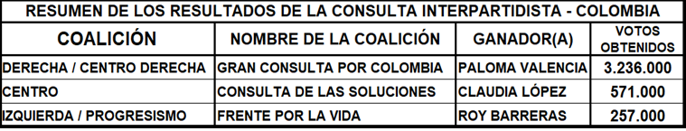 Las elecciones en Colombia del pasado 8 de marzo de 2026 constituyeron un verdadero terremoto político. No solo se renovó el Congreso, sino que las Consultas Interpartidistas definieron quiénes serán los pesos pesados que competirán por la Presidencia el próximo 31 de mayo. Participaron coaliciones: 1°) la Coalición de Derecha/Centro Derecha (Gran Consulta por Colombia), quedando como ganadora Paloma Valencia que obtuvo más de 3.2 millones votos. 2°) la Coalición del Centro (Consulta de las Soluciones), quedando en esta coalición como ganadora Claudia López (exalcaldesa de Bogotá), obteniendo más de 570.000 votos que obtuvo más de 570.000 votos y 3°) la Coalición de Izquierda/Progresismo (Frente por la Vida), alzándose como ganador Roy Barreras con unos 257.000 votos.