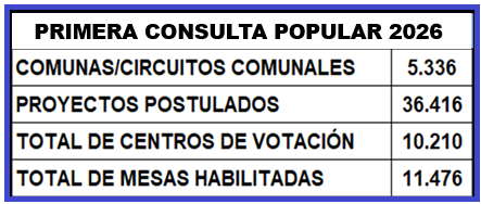 La campaña electoral para este evento inició el pasado sábado 21 de febrero y la misma tiene como propósito impulsar 36.367 distribuidos en las 5.336 Comunas o Circuitos Comunales. Durante este lapso de campaña cada una de las Comunas y Consejos Comunales deberá comunicar a sus habitantes los proyectos priorizados para su conocimiento y deliberación, con el objetivo de que la ciudadanía vote sobre qué iniciativas deben recibir respaldo y cómo se gestionará su ejecución. El CNE habilitó una plataforma digital para que los venezolanos puedan ubicar con mayor facilidad el centro de votación correspondiente a su comuna o circuito comunal, así como los proyectos postulados en el Circuito Comunal del interesado. Para tal fin, el interesado deberá accesar a https://consultapopular.cne.gob.ve.
