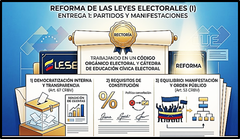 Desde la Rectoría que dirijo, hemos estado trabajando en ese tema, señalando cuáles son las leyes que deben reformarse y el por qué, así como la creación de un Código Orgánico Electoral y una Cátedra de Educación Cívica Electoral. En esta primera entrega haré alusión a la Reforma de la Ley de Partidos Políticos, Reuniones Públicas y Manifestaciones, ley que data del año 1965.