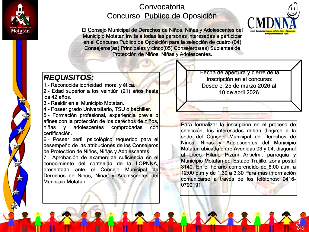 El Consejo Municipal de Derechos del Niño, Niña y Adolescente (CMDNNA) del municipio Motatán invita a todas las personas interesadas a participar en el “Concurso Público de Oposición” para la selección de cuatro (04) Consejeros (as) principales y cinco (05) Consejeros (as) de Protección de Niños, Niñas y Adolescentes.
