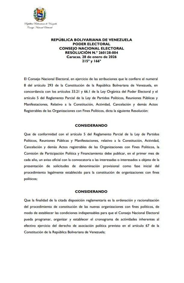 El Consejo Nacional Electoral (CNE) suspendió de forma temporal el proceso para la creación y registro de nuevas organizaciones políticas en Venezuela. La decisión, adoptada el 28 de enero de 2026, aparece en la resolución N° 260128-004, firmada por el presidente del ente, Elvis Amoroso, y el secretario general, Antonio José Meneses Rodríguez, publicada ese jueves en la cuenta en Telegram del organismo.