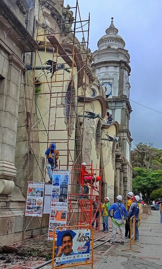 Belandria precisó que se desplegaron cuatro frentes de trabajo para la restauración de cornisas, limpieza y remoción de plantas parásitas, así como la recuperación de los revestimientos de granito maquillado y la remoción de frisos deteriorados.