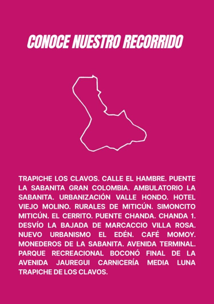 La ruta oficial ya fue difundida por la ONG, partida desde el museo Trapiche de los Clavo, caminando por la calle del hambre, puente de la Sabanita, hasta llegar a la urbanización Valle Hondo, después a la Rurales de Miticún, hasta llegar a Chandá, seguir por Los Monederos de la Sabanita, caminando fuera del Parque recreación al Boconó, hasta retornar al Museo.