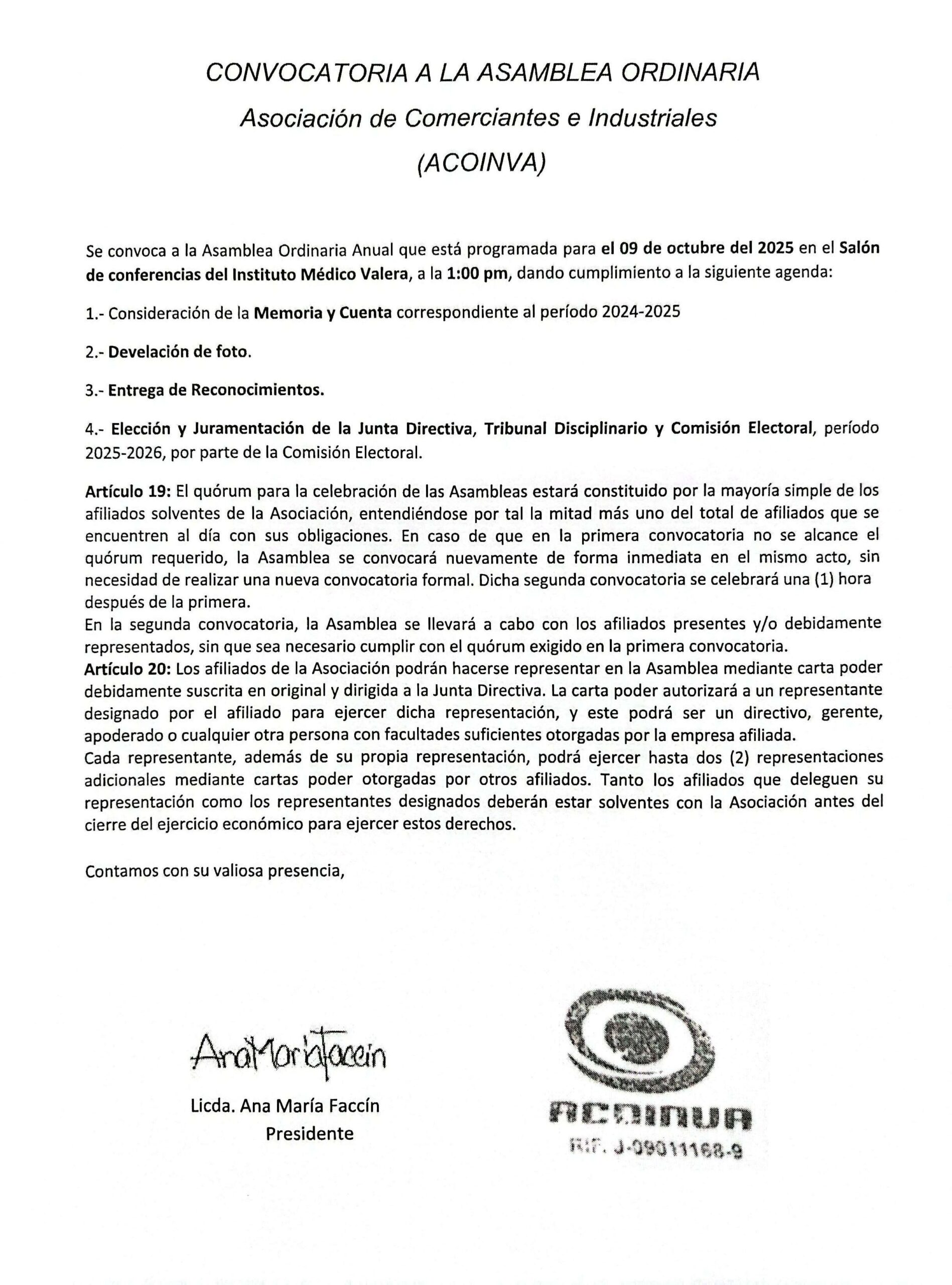 Convocatoria Asamblea Ordinaria de la Asociación de Comerciantes e Industriales de Valera (ACOINVA)