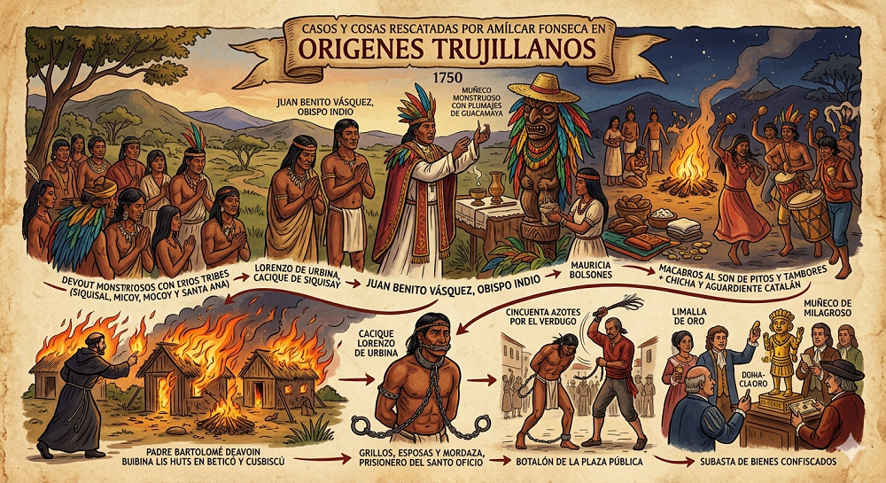 Amílcar Fonseca también nos mostró otra leyenda que cuenta que el cacique Lorenzo de Urbina a quien el alcalde ordinario de Trujillo nombró provincial, tenía una cajeta llena de limalla de oro en polvo, un muñeco también del mismo metal, me supongo yo pequeño, su Dios milagroso que no lo mostraba sino por ofrendas de gran valor. A este personaje lo persiguió el Padre Bartolomé Deavoin, quemó las casas de este piachi en Beticó, Cusbiscú que olían a santería y lo reclamaba a las justicias con persecución como doctrinante suyo.