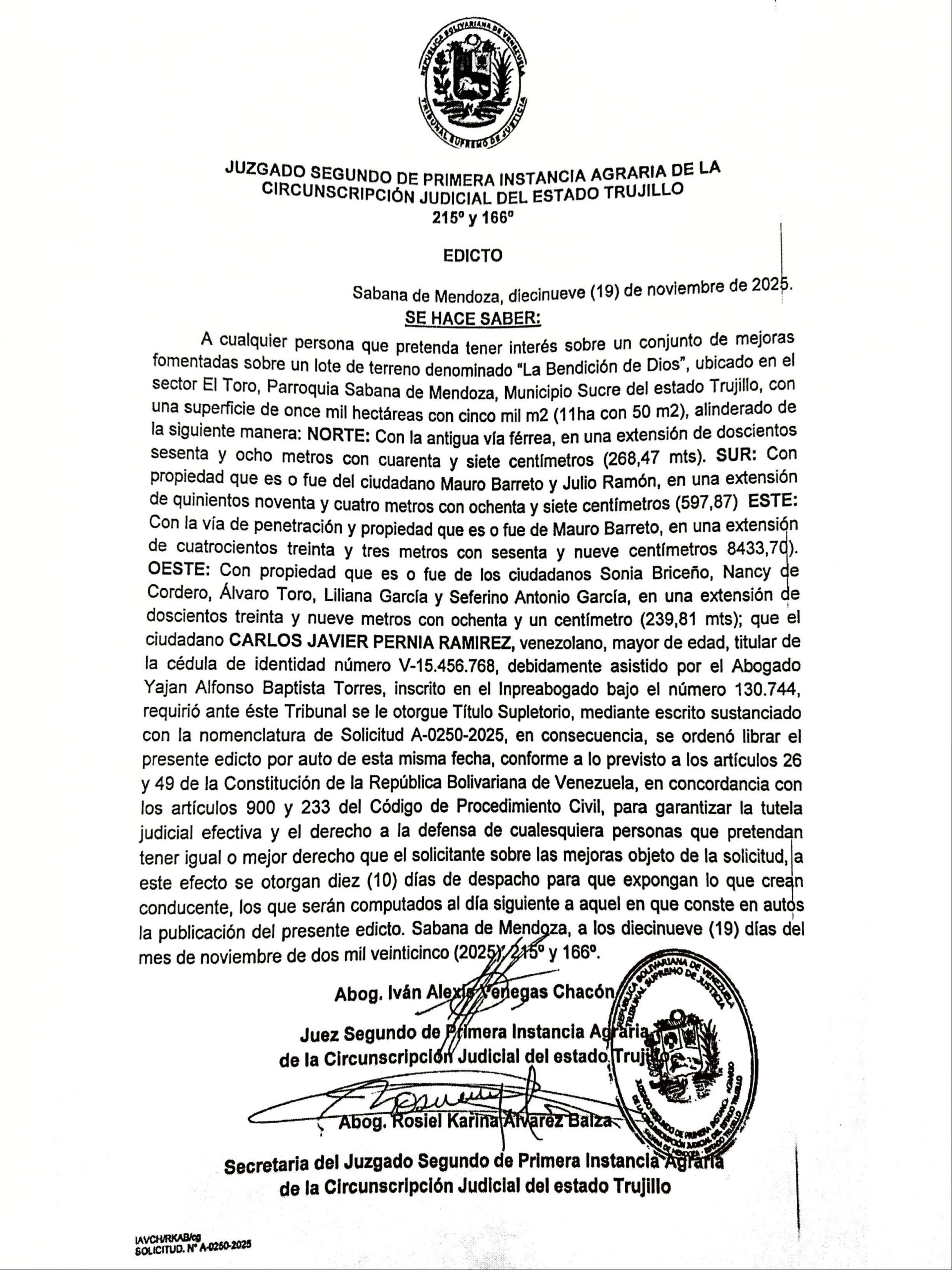 EDICTO. Se hace saber A cualquier persona que pretenda tener interés sobre un conjunto de mejoras fomentadas sobre un lote de terreno denominado «La Bendición de Dios», ubicado en el sector El Toro, Parroquia Sabana de Mendoza, Municipio Sucre del estado Trujillo