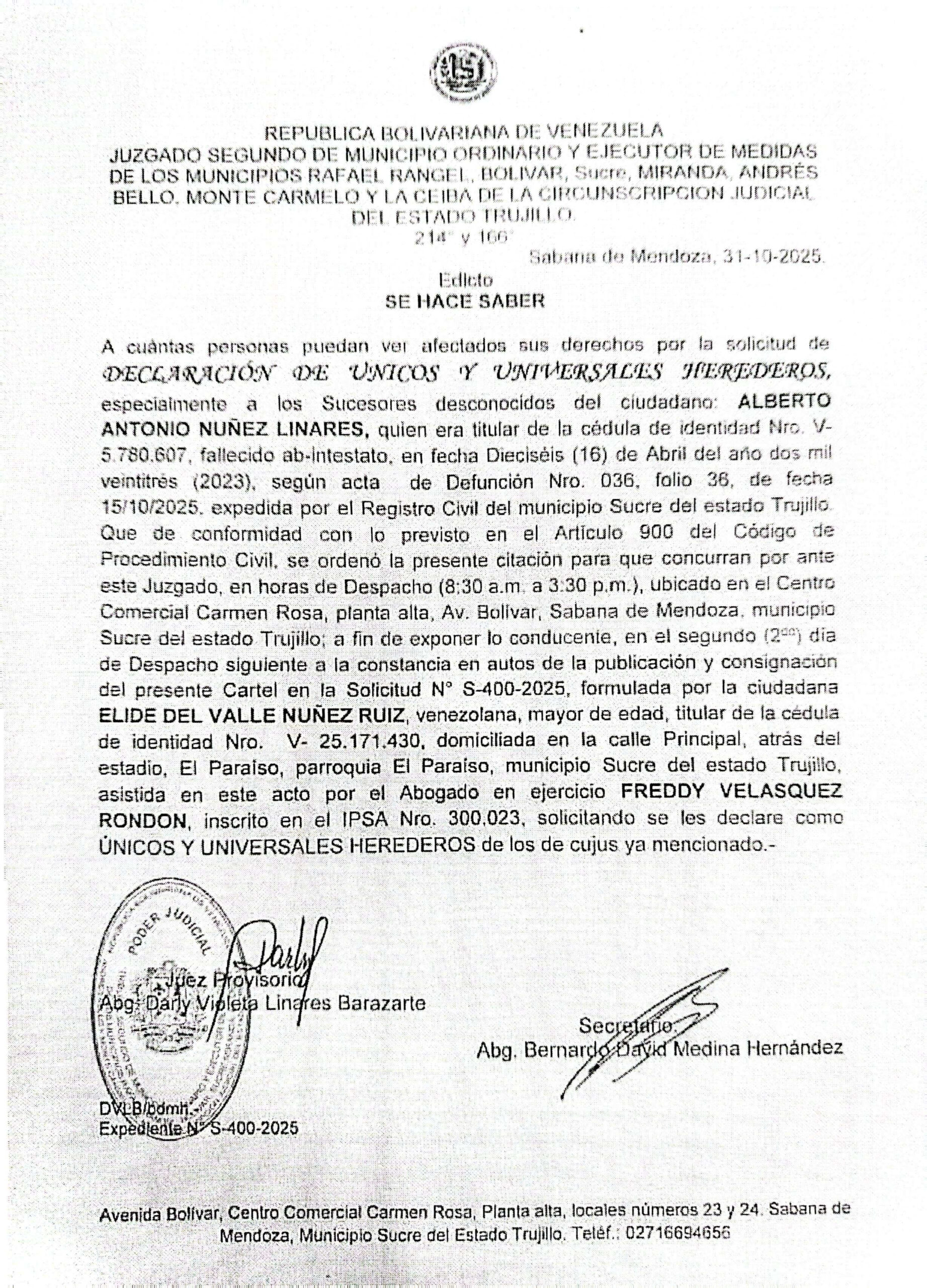 EDICTO. Se hace saber a cuantas personas puedan ver afectados sus derechos por la solicitud de DECLARACIÓN DE UNICOS Y UNIVERSALES HEREDEROS, especialmente a los Sucesores desconocidos del ciudadano: ALBERTO ANTONIO NUÑEZ LINARES, quien era titular de la cédula de identidad Nro. V- 5.780.607