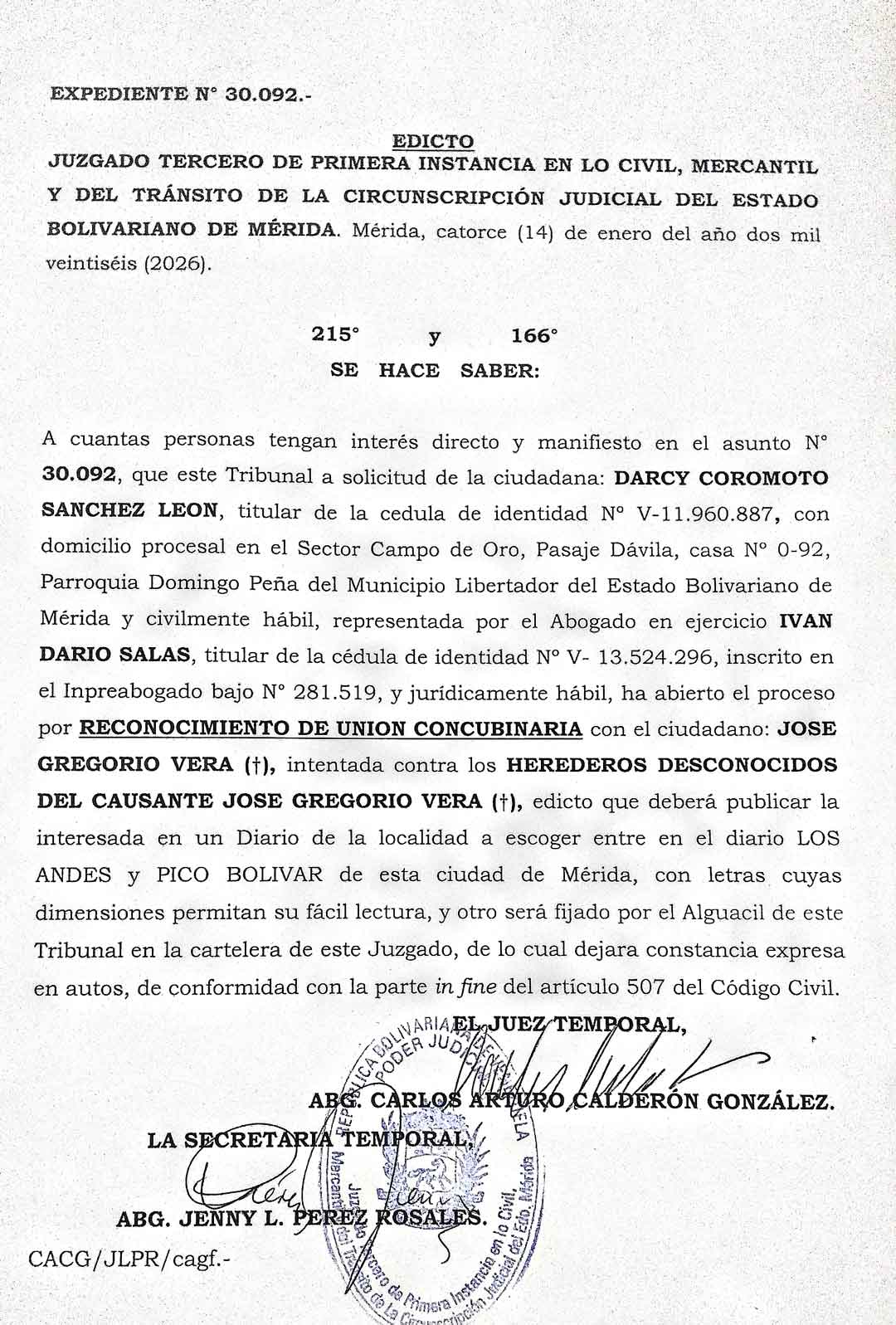 Edicto. Se hace saber a los herederos desconocidos del de Cuius Fernando Hernández Merchán, que en el juicio que por ACCIÓN MERO DECLARATIVA CONCUBINARIA, sigue contra los ciudadanos; Hernández Mendoza Lisbeth Yelipza, Hernández Mendoza Francisth Marisol y Hernández Arellano Fernando José (22/01/2026)