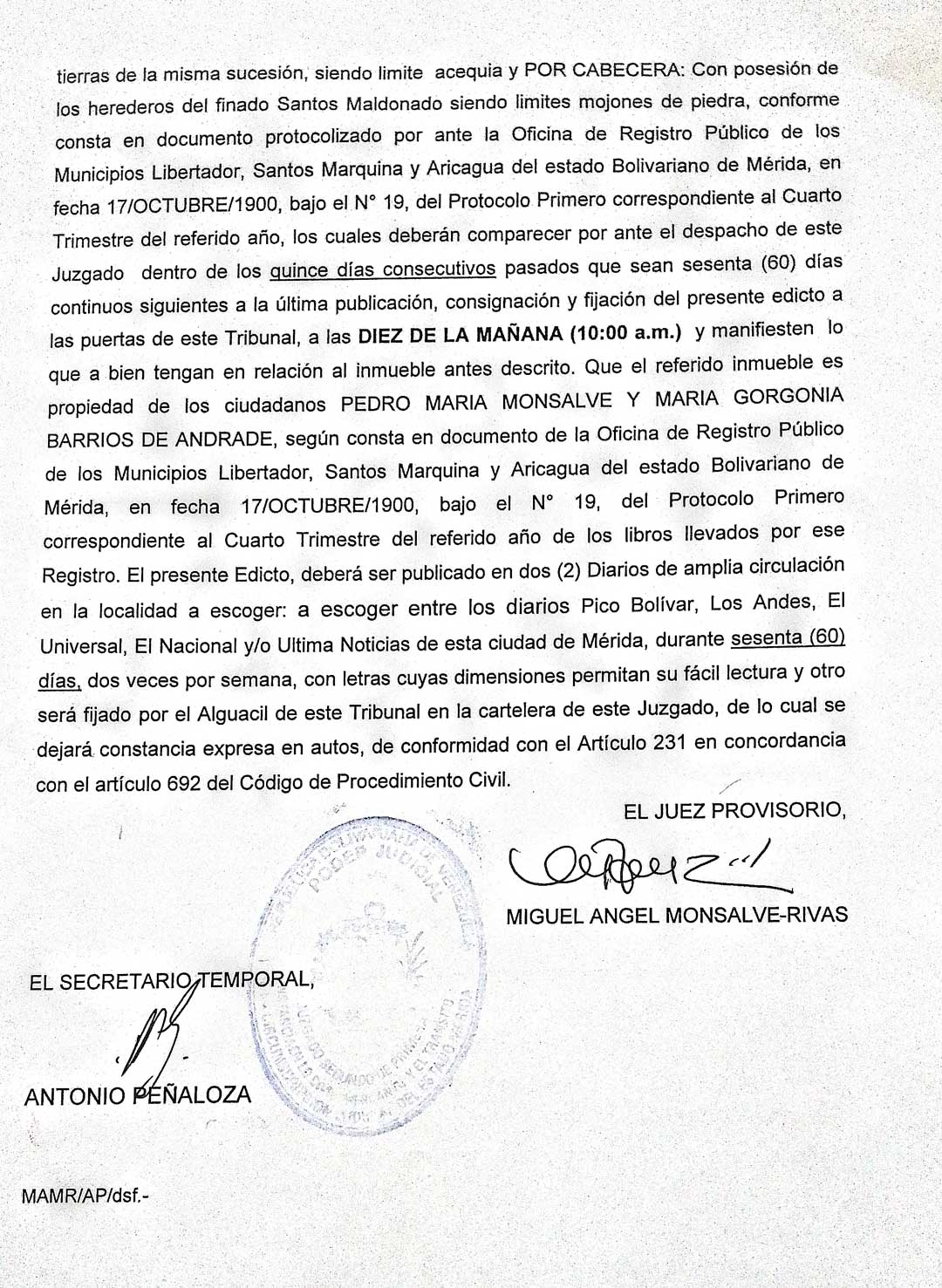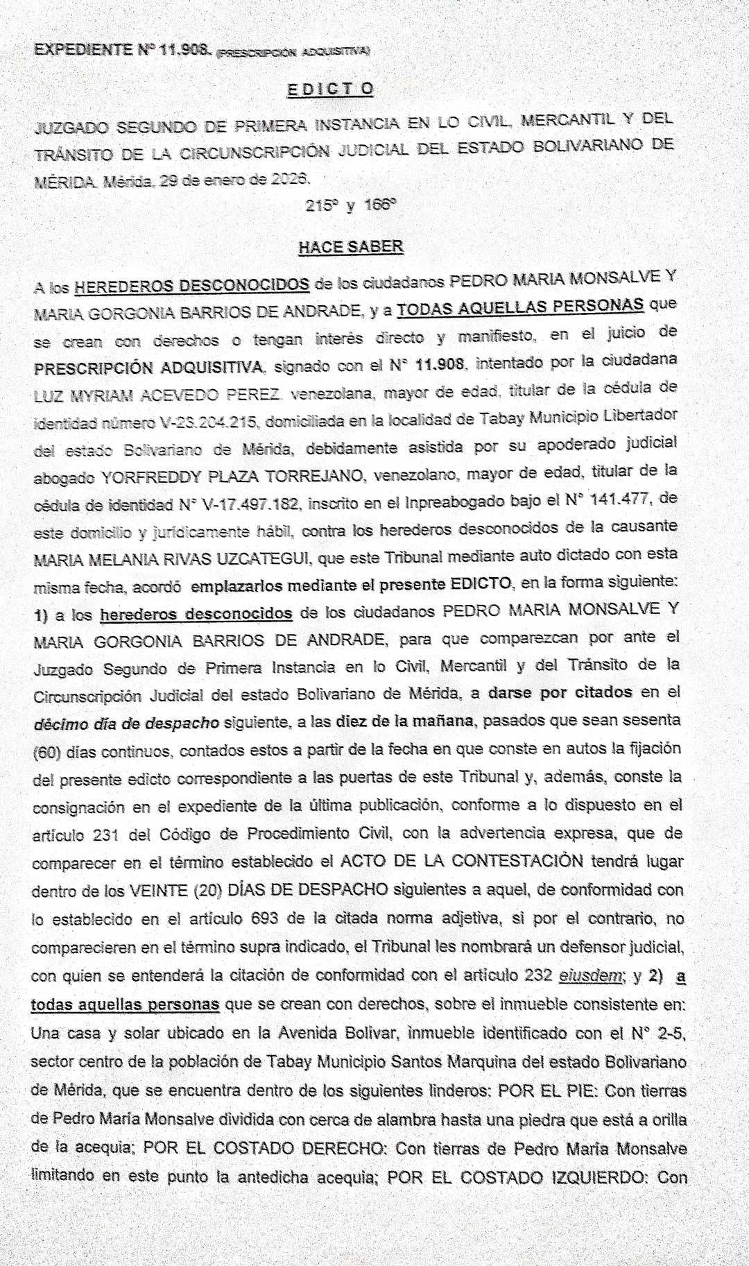 EDICTO. Se hace saber A los HEREDEROS DESCONOCIDOS de los ciudadanos PEDRO MARIA MONSALVE Y MARIA GORGONIA BARRIOS DE ANDRADE, y a TODAS AQUELLAS PERSONAS que se crean con derechos o tengan interès directo y manifiesto, en el juicio de PRESCRIPCIÓN ADQUISITIVA, contra los herederos desconocidos de la causante MARIA MELANIA RIVAS UZCATEGUI (11-02-2026)