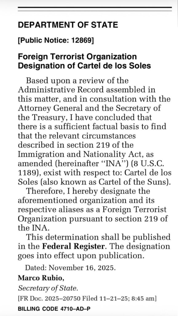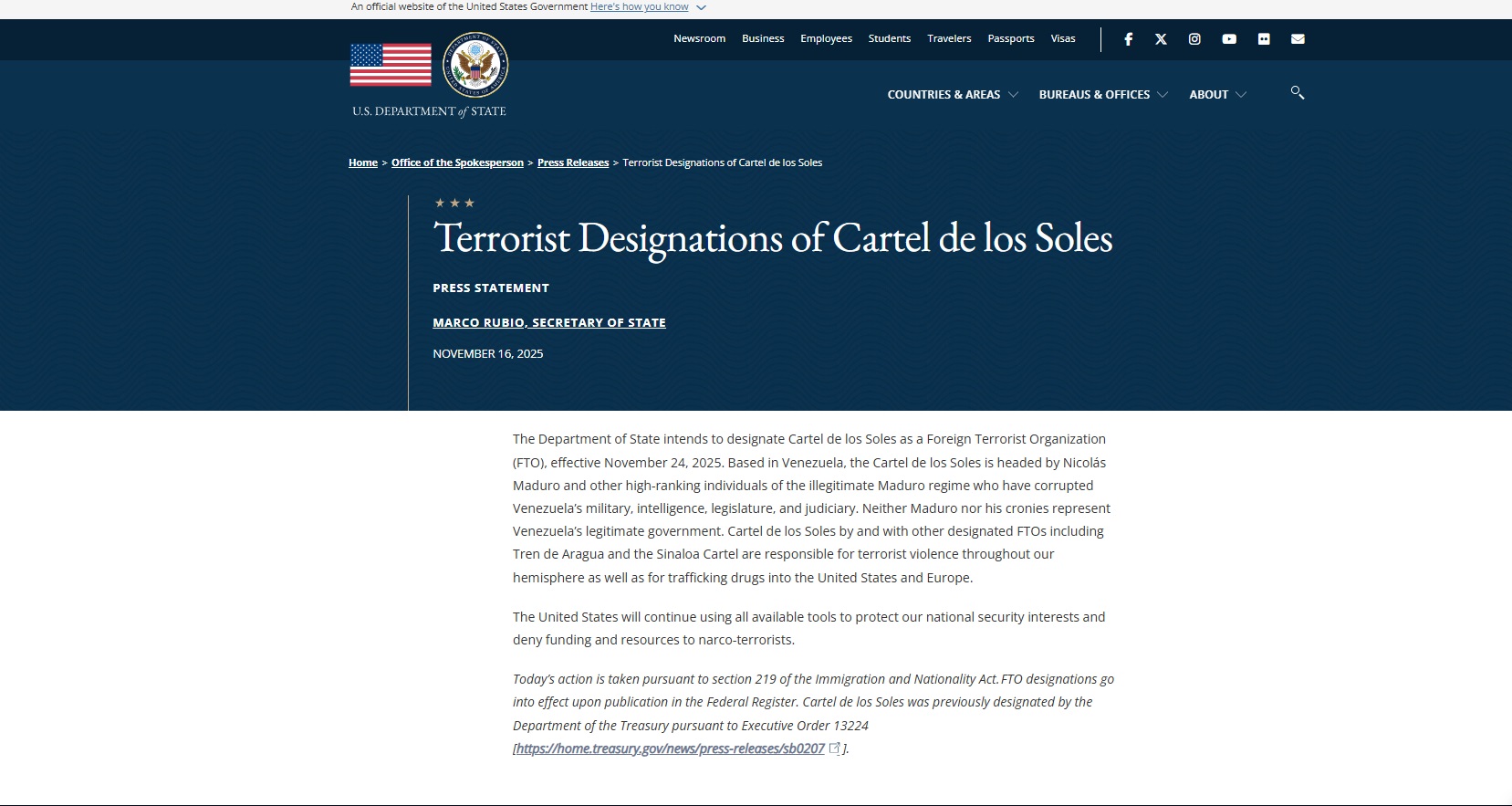 Tras avanzarlo este fin de semana, el Departamento de Estado estadounidense confirmó la designación oficial de esta organización como FTO con una publicación en el Registro Federal, lo que da a la Administración del presidente, Donald Trump, herramientas adicionales para aumentar la presión sobre el Gobierno del venezolano Nicolás Maduro.