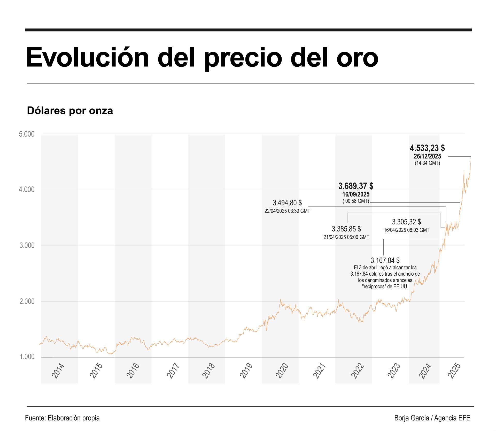 Madrid, 26 dic (EFECOM).- El precio del oro ha alcanzado este viernes un nuevo máximo histórico al superar los 4.533 dólares por onza, en una jornada de festividad para la mayoría de los mercados bursátiles internacionales.