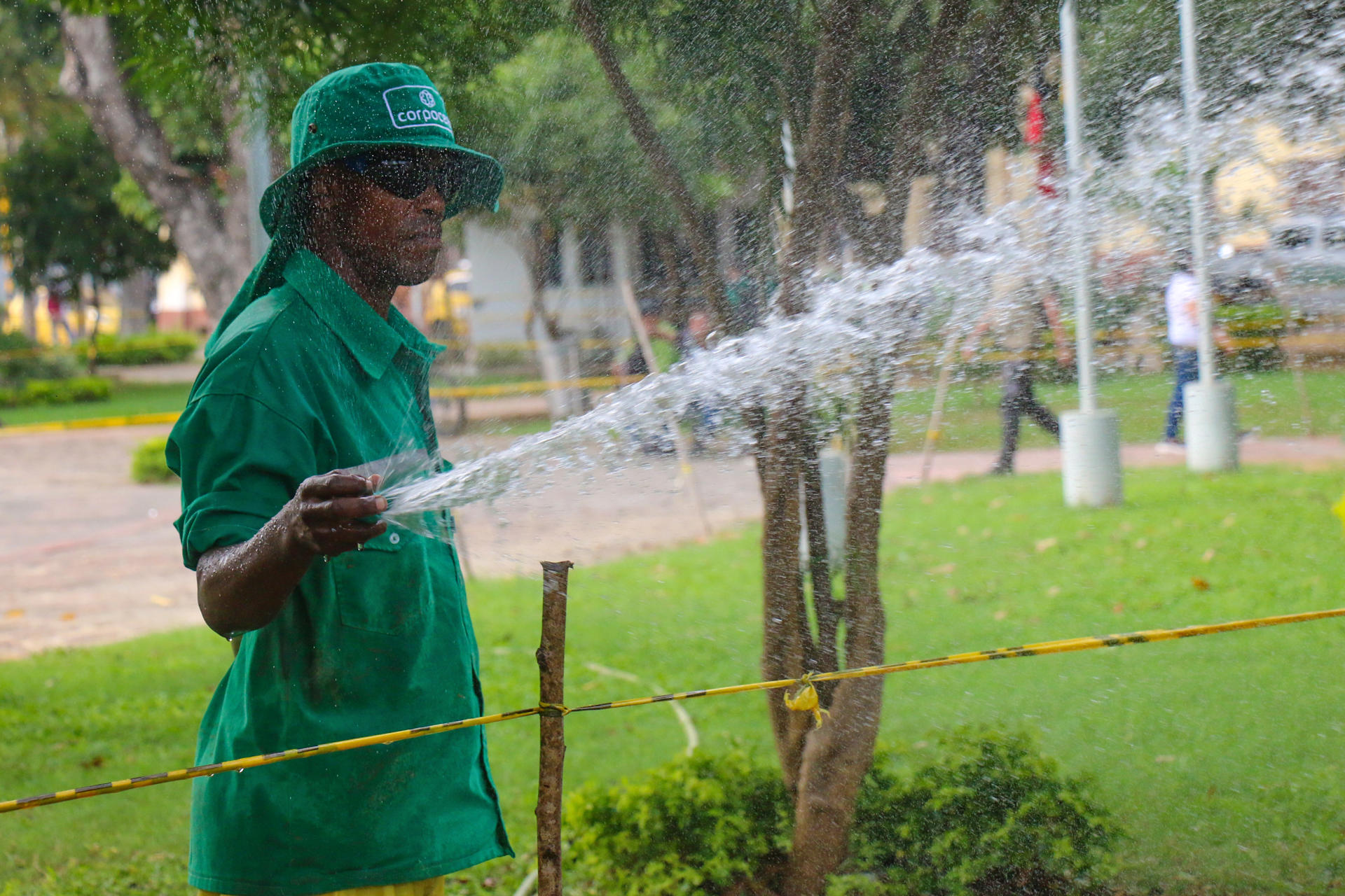 Fotografía del 13 de febrero de 2026 que muestra al ciudadano venezolano residente en Colombia Cristopher Landazuri regando plantas un parque en Cúcuta (Colombia). EFE/ Mario Caicedo