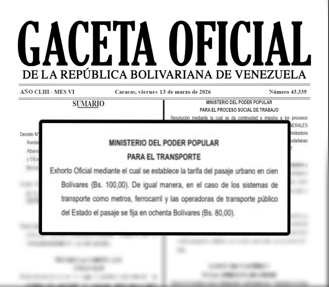 El Ministerio de Transporte oficializó el incremento del pasaje mínimo en todo el territorio nacional en la Gaceta Oficial número 43.335, con fecha administrativa del viernes 13 de marzo.