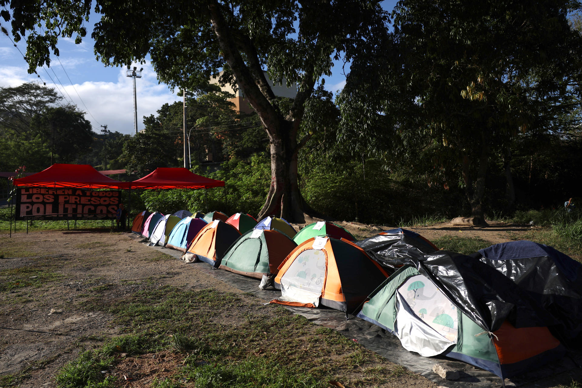 Fotografía que muestra carpas de familiares de presos políticos frente al centro penitenciario Rodeo I este 22 de enero de 2026, en Zamora estado de Miranda (Venezuela). EFE/ Miguel Gutiérrez