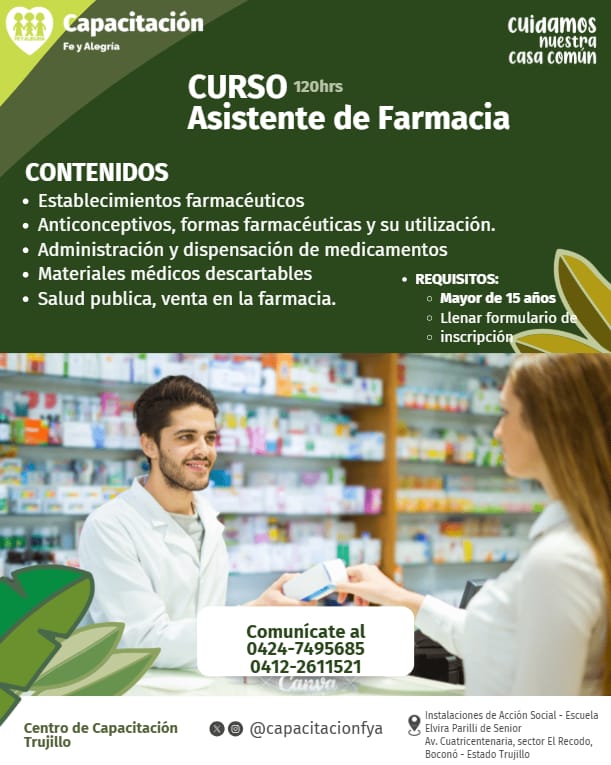 Entre los cursos que están promoviendo están asistente de farmacia, con la duración de 12 horas, que se desarrollará en las instalaciones de Acción Social, Fé y Alegría, los días lunes, miércoles y viernes, previsto a iniciar la primera semana de febrero.