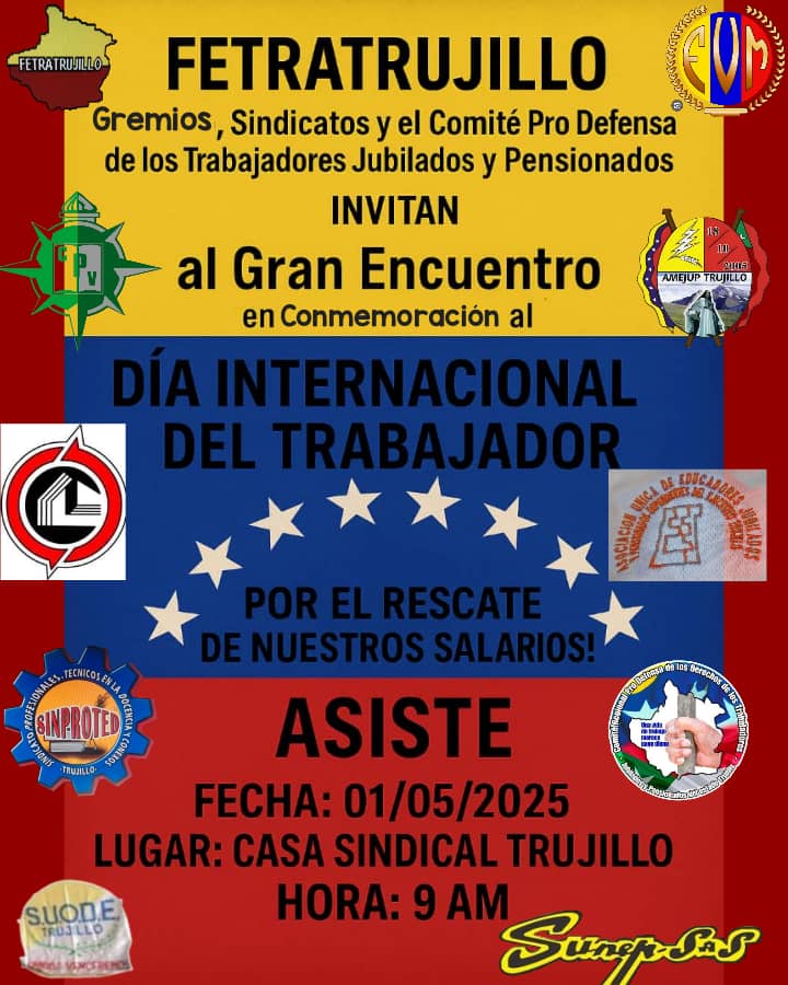 En el marco de la conmemoración del Día Internacional del Trabajador, la Federación de Trabajadores del Estado Trujillo hace un llamado a todos los trabajadores, jubilados y pensionados de la región a participar en el Gran Encuentro «¡Por el Rescate de Nuestros Salarios!», que se llevará a cabo el próximo 1 de mayo en la sede de la Casa Sindical de Trujillo.
