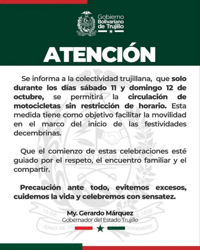 La Gobernación del Estado Trujillo detalló que esta medida tiene como objetivo «facilitar la movilidad en el marco del inicio de las festividades decembrinas».