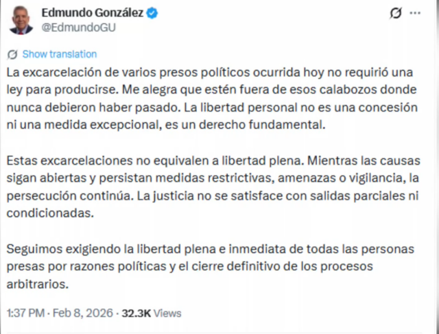 En X, González Urrutia subrayó que estas excarcelaciones «no equivalen a libertad plena» debido a que las causas siguen abiertas y persisten medidas restrictivas.