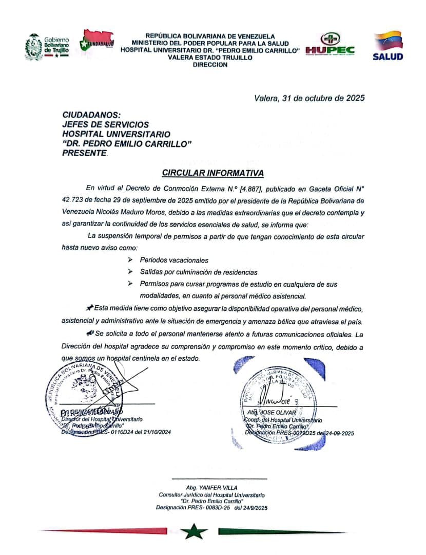 La Dirección del Hospital Universitario «Dr. Pedro Emilio Carrillo» (HUPEC), de Valera, ha emitido una Circular Informativa de alto impacto para anunciar la suspensión temporal de todos los permisos para el personal médico asistencial. La medida, con efecto inmediato y hasta nuevo aviso, se justifica en la necesidad de asegurar la disponibilidad operativa del personal ante una “situación de emergencia y amenaza bélica que atraviesa el país”.