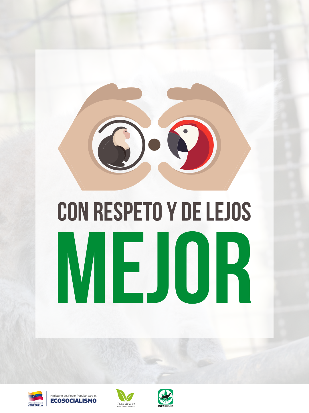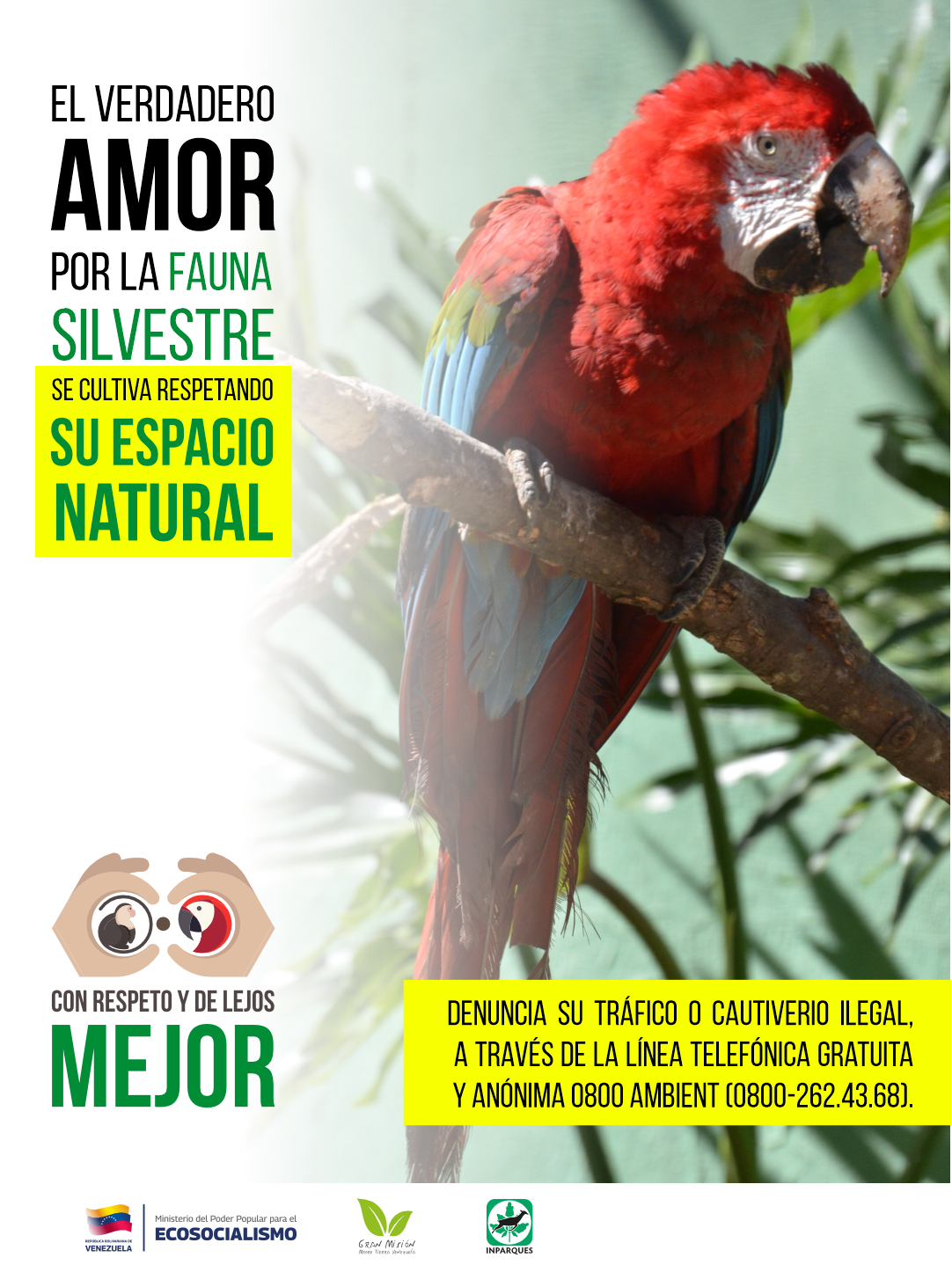 La campaña “Con respeto y de lejos mejor”, enfatiza que el verdadero amor hacia nuestra fauna silvestre, se cultiva con el respeto a su espacio natural y denunciando el trato humanizado, su tráfico o cautiverio ilegal, a través de la línea telefónica gratuita y anónima 0800 AMBIENT (0800-262.43.68).  /Prensa MinEcosocialismo